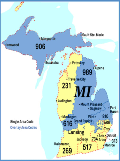 Area Codes In Michigan Map – Given below is the complete list of area codes in United States. The table below shows all the 291 area codes in United States. United States area codes usually have 3 digits. While calling United . Detailed state-county map of Michigan. Michigan County Map Highly-detailed Michigan county map. Each county is in it’s own separate labeled layer. County names are in a separate layer and can be .